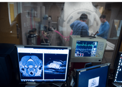 Through the glass, you can see the MRI machine and the Images it takes are in the foreground. The patients are monitored during the procedure by the BAVI team